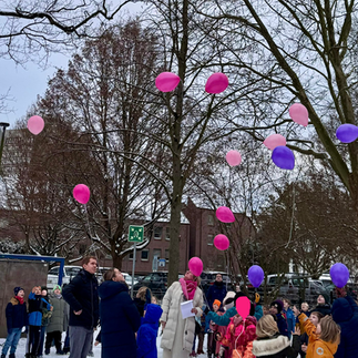 Zum Abschluss der Andacht gingen wir gemeinsam auf den Schulhof und ließen bunte Luftballons in den Himmel steigen. So schickten wir unsere Gedanken und Erinnerungen zu Frau Gießler. Begleitet von Gebeten und Liedern war diese Andacht ein tröstlicher Moment, um gemeinsam Abschied zu nehmen.